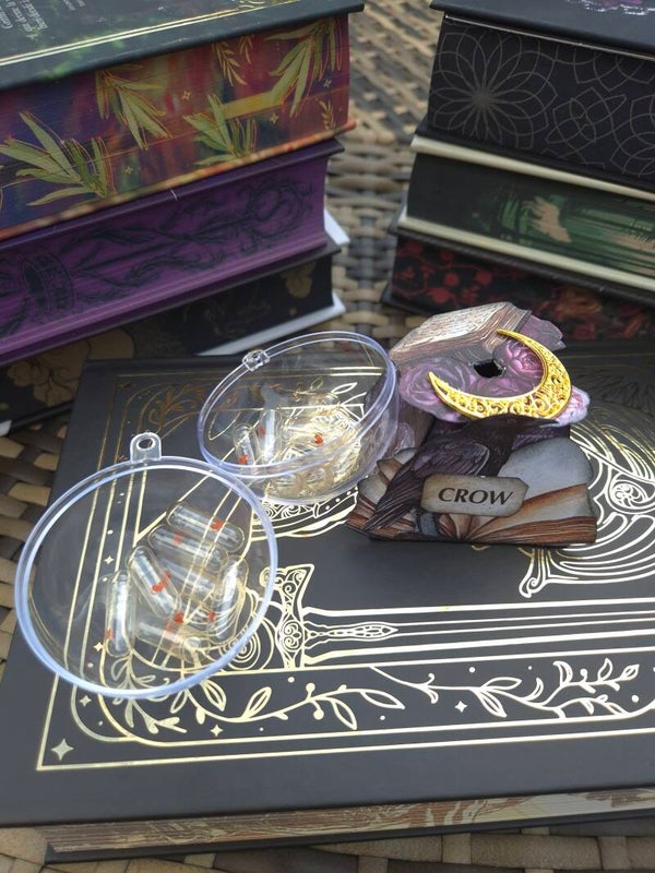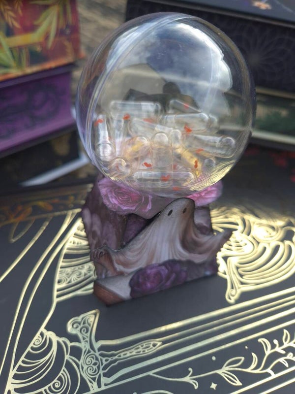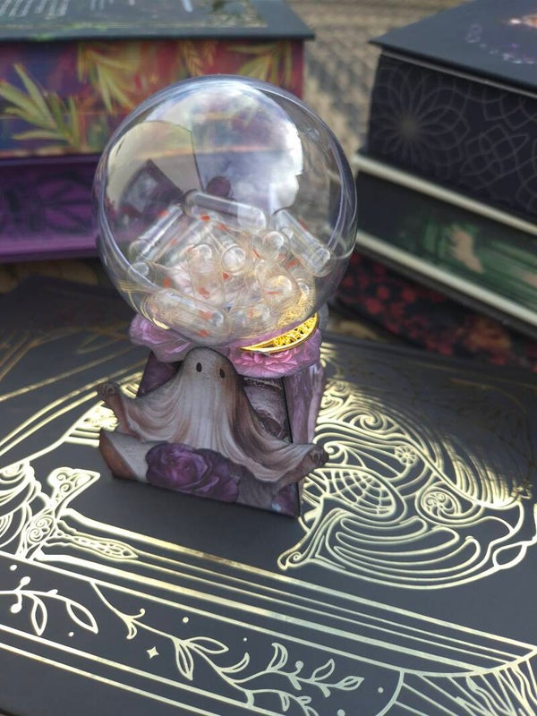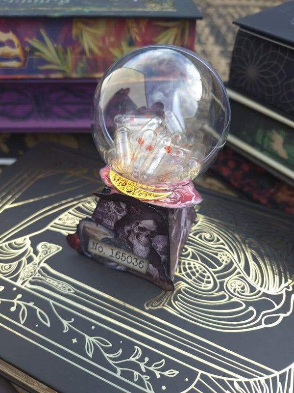 - Un défi de lecture - Une aide considérable en cas de panne de lecture, ou lorsque nous sommes indécis sur le prochain livre à débuter. Format fun et ludique, une petite boule de divinations aux couleurs d'halloween, comportant 18 comprimés (attention, fictif, non comestible, et à mettre hors de porté des enfants pour éviter tout accident). Dans chaque comprimé, qui sera à ouvrir, sera inscrit le titre du prochain ouvrage à lire (merci de me communiquer la liste de votre pile à lire que vous souhaitez que je note). A savoir que ce défi en vue de la réalisation entièrement fait main, il est conseiller de le réaliser et après de conserver le support en décoration. Une fois que vous avez lu et vider votre pal de 18 livres, je vous conseille de venir coller la boule sur votre support, pour pouvoir la garder dans le temps, en décoration de bibliothèque.
